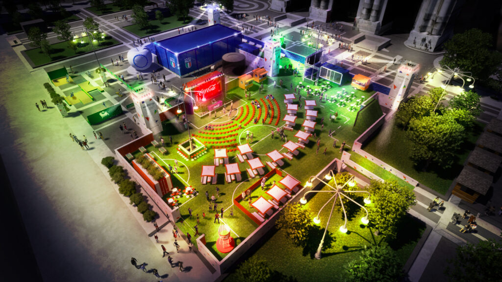 Fan Zone con ristoro, aree gioco e schermo per assistere alle partite